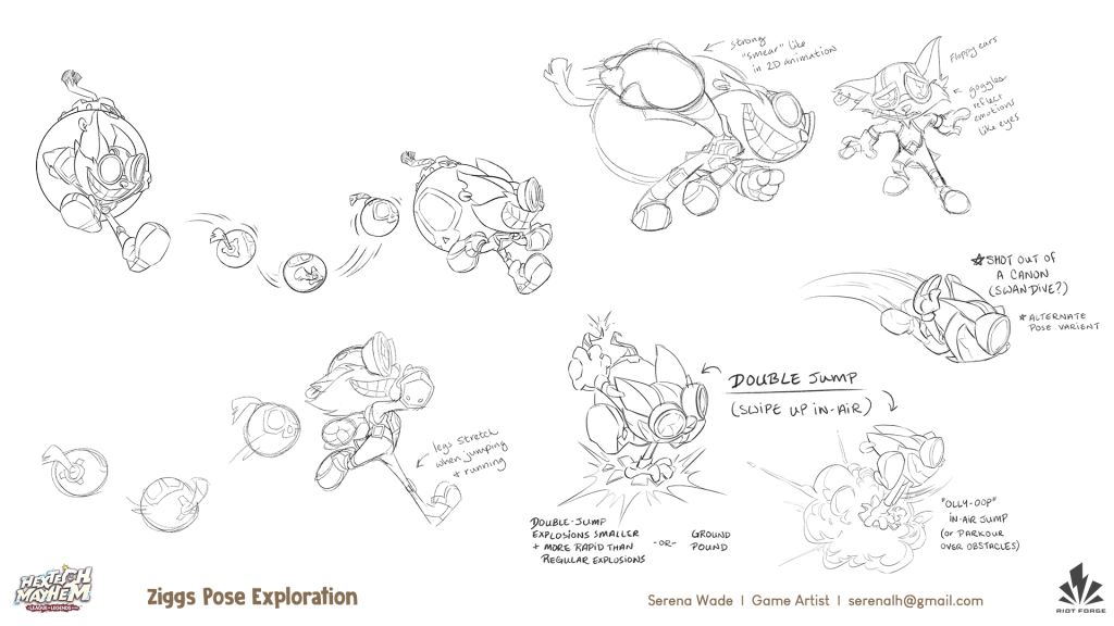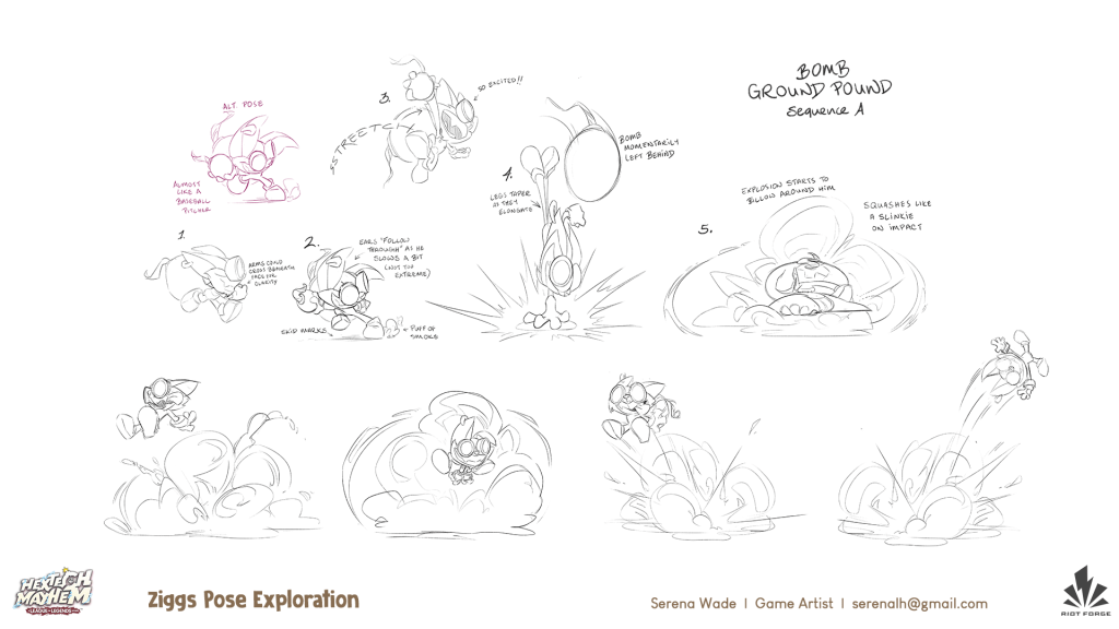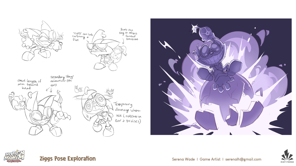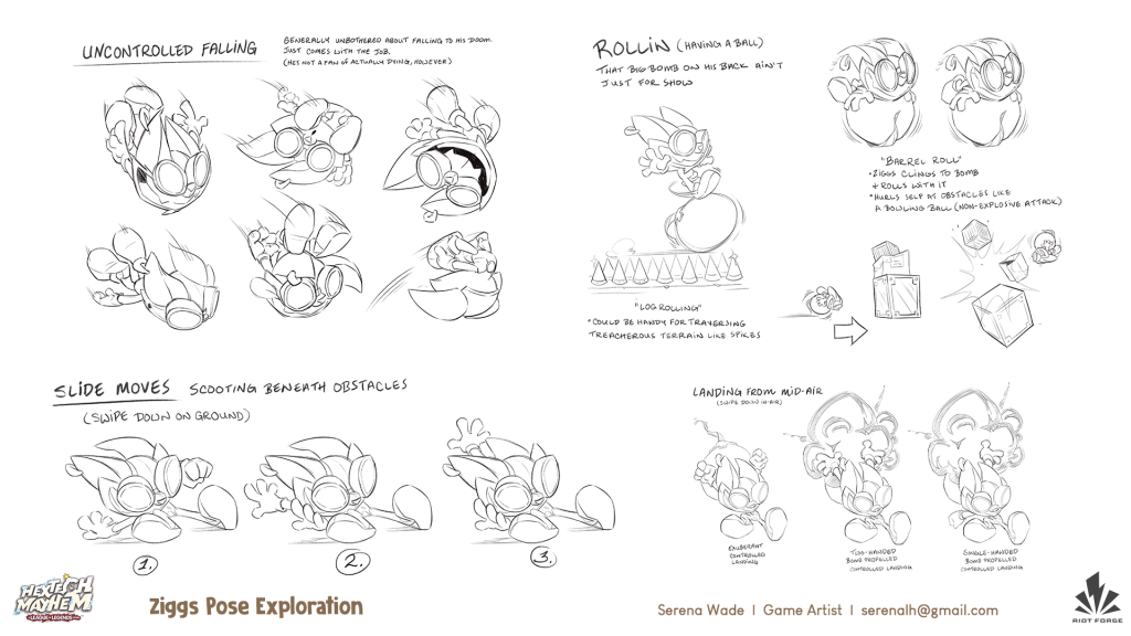 Created concept art, character animation key pose sketches, expressions, highly stylized props, building interiors, functional concept art and turnarounds, and achievement badges. It’s fun to let loose on such a wacked-out unhinged bomb-o-maniac!